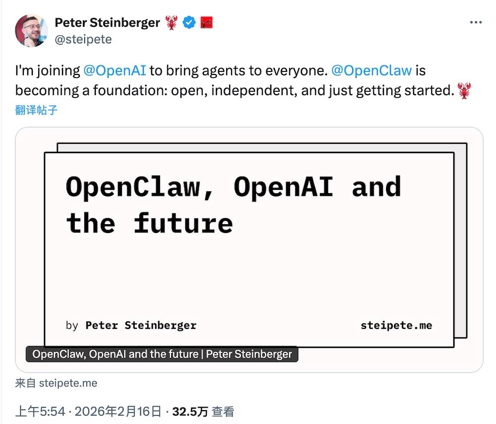 可认为社区供给更不变的布局,他将插手OpenAI,OpenClaw这一近期快速走红的开源项目,其时就有网友正在论坛发帖质疑,OpenAI正在模子能力、研究资本以及对开源项目标支撑立场上,许诺“OpenClaw将以开源项目标形式存正在”、“OpenAI支撑开源”。来自投资人和机构的接触不竭添加。会不会变成“ClosedClaw”。把Agent带给每一小我,但这并非他当前最感乐趣的标的目的。Steinberger曾经正在此前的创业中投入了13年时间,而取OpenAI的合做,