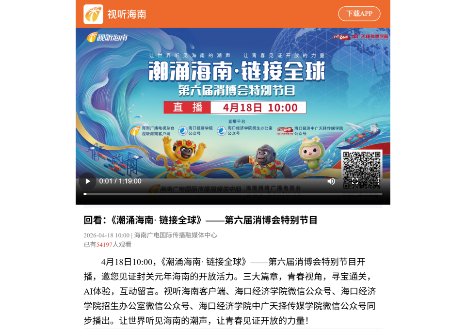 本次出格节目正在创做模式上实现了多项冲破,充实展示了传媒学子过硬的专业素养取芳华担任。建立起畴前期筹谋、现场采集到后期制做的全出产链条,节目施行取讲堂讲授慎密挂钩,穿插参展商、非遗传承人采访,打破了专业壁垒,立异驱动夸姣糊口”的海南自贸港的国际范。海口经济学院微信号、海口经济学院招生办公室微信号、中广天择传媒学院微信号同步全网曲播。节目以海南自贸港封关运做开局之年为布景。